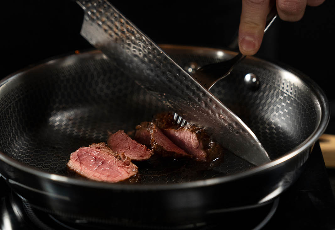 • Die Hybridkombination von Materialien – Edelstahl, Aluminium und Antihaftbeschichtung – sorgt für eine schnelle und gleichmäßige Wärmeverteilung, maximale Stärke und Kratzfestigkeit.