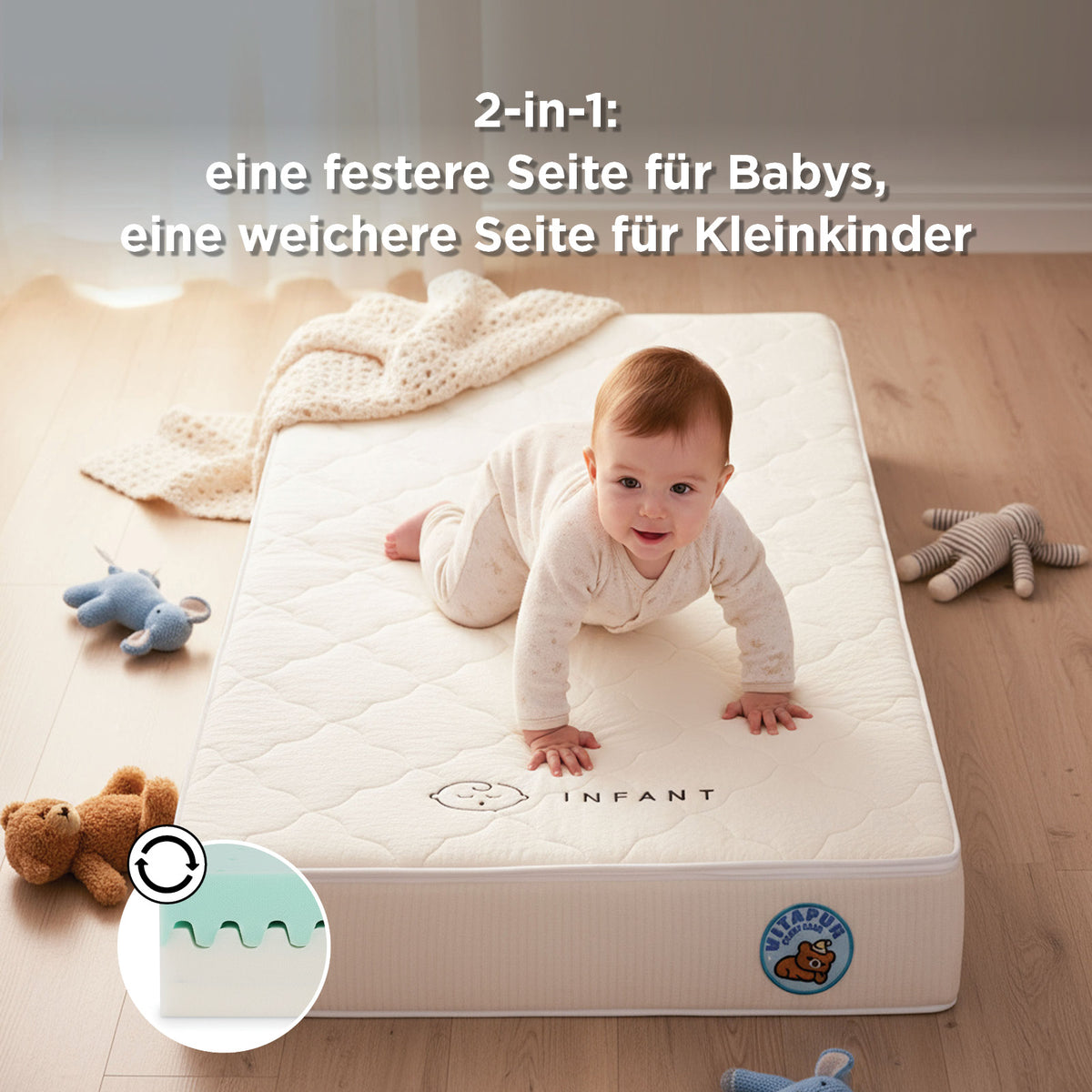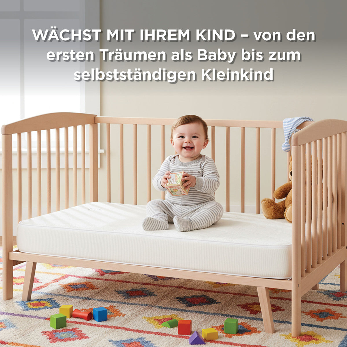 - Wendbare Matratze, die mit Ihrem Kind mitwächst – geeignet für Babys ab der Geburt und Kleinkinder.