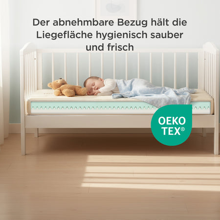 - Der leicht abnehmbare Bezug ist bei 40 °C waschbar, damit Ihr Kind immer in einer sauberen und frischen Umgebung schläft.