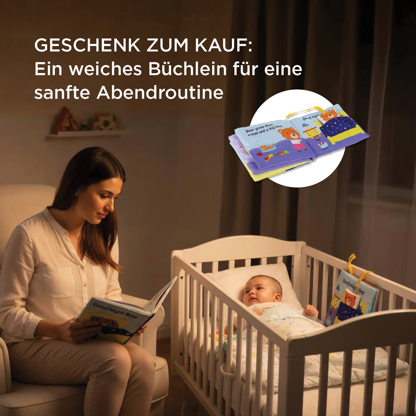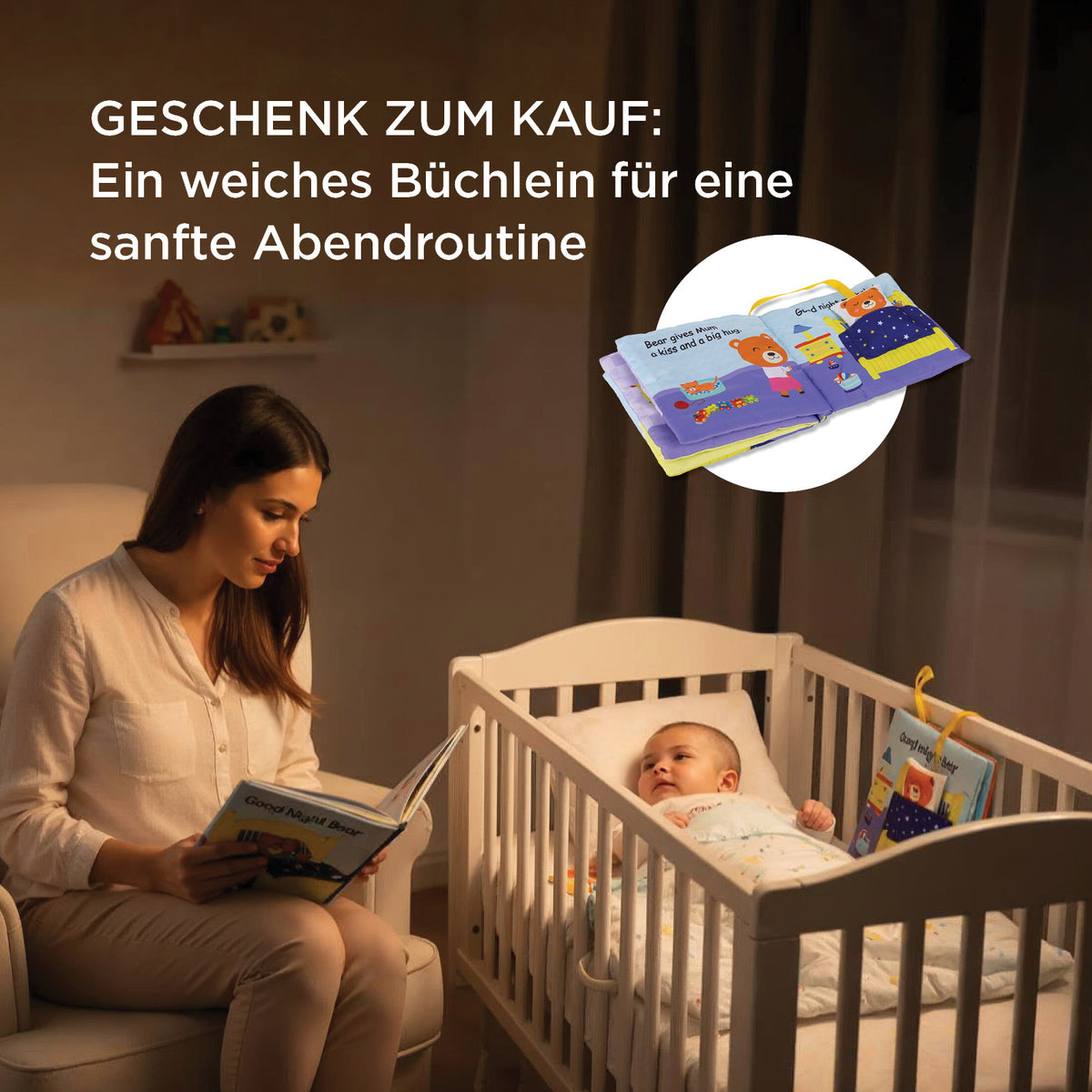 - Inklusive eines weichen Büchleins für liebevolle Momente während des Abendrituals.