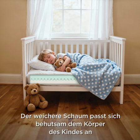 - Die Kombination aus weicherem und festerem Schaum bietet optimale Unterstützung der Wirbelsäule in allen Schlafpositionen und Entwicklungsphasen.
