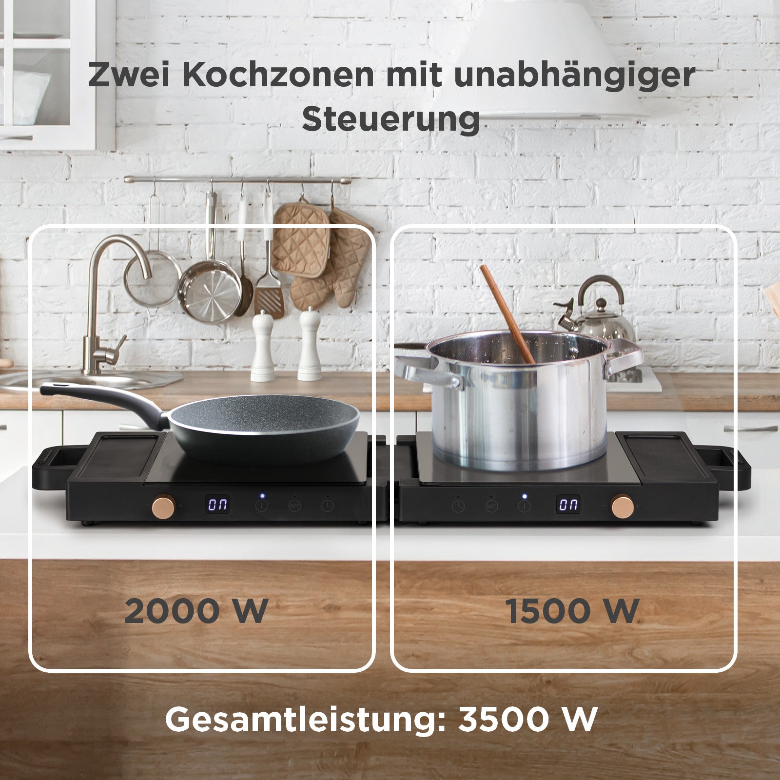 - Zwei Kochflächen mit insgesamt 3500 W Leistung für gleichzeitiges Kochen ohne Kompromisse.