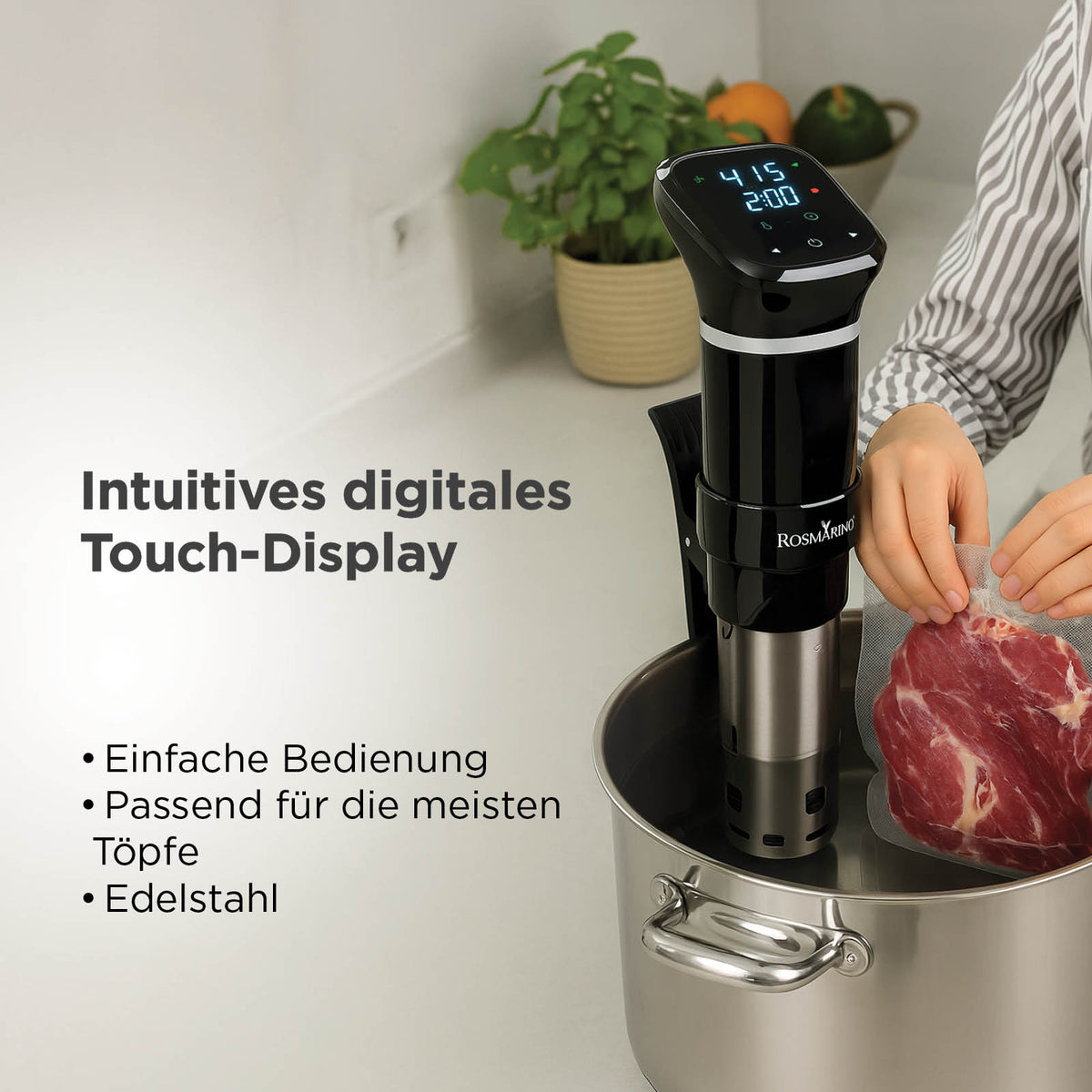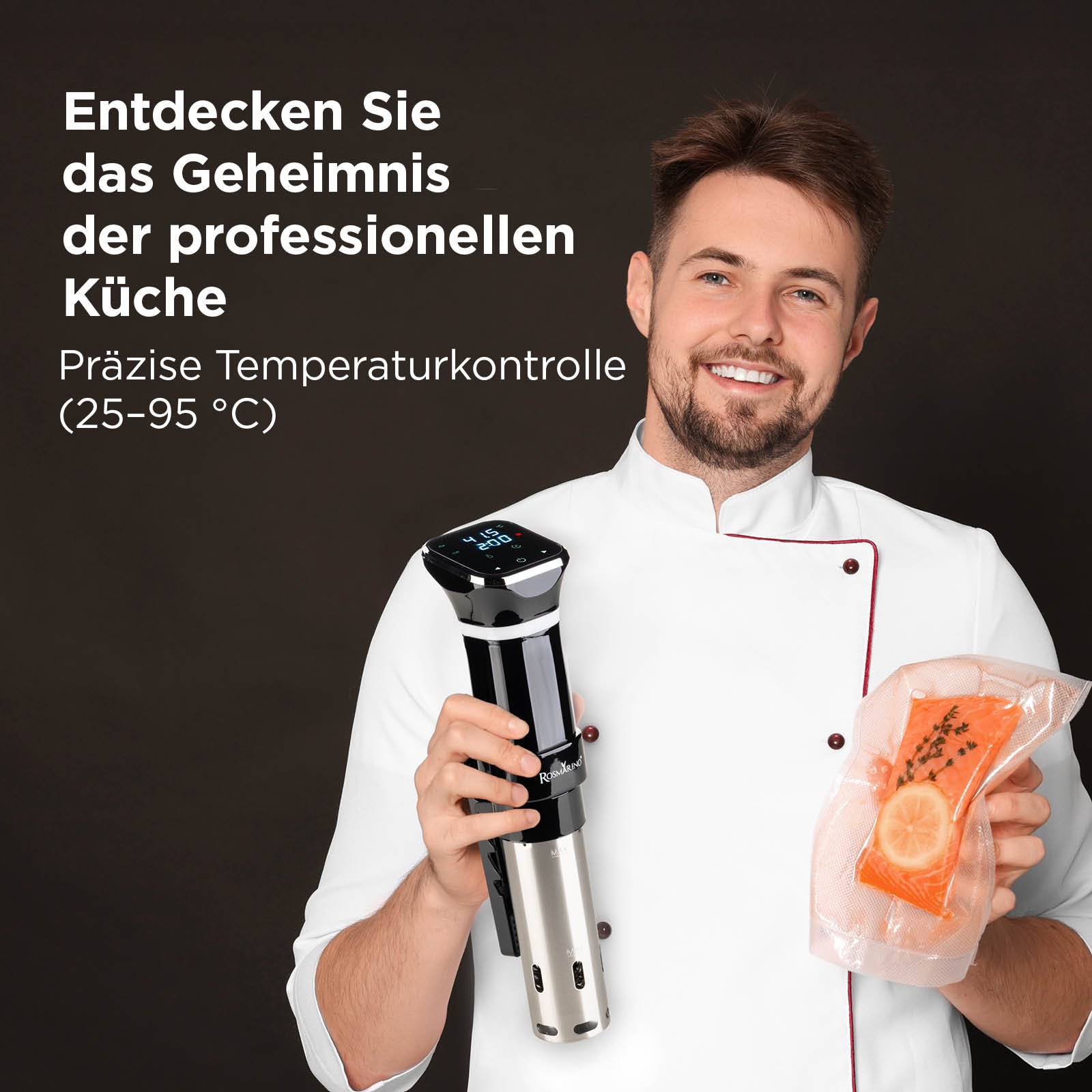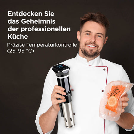 - Präzise Temperaturkontrolle (25–95 °C) für die ideale Zubereitung von Fleisch, Fisch, Gemüse oder Eiern.