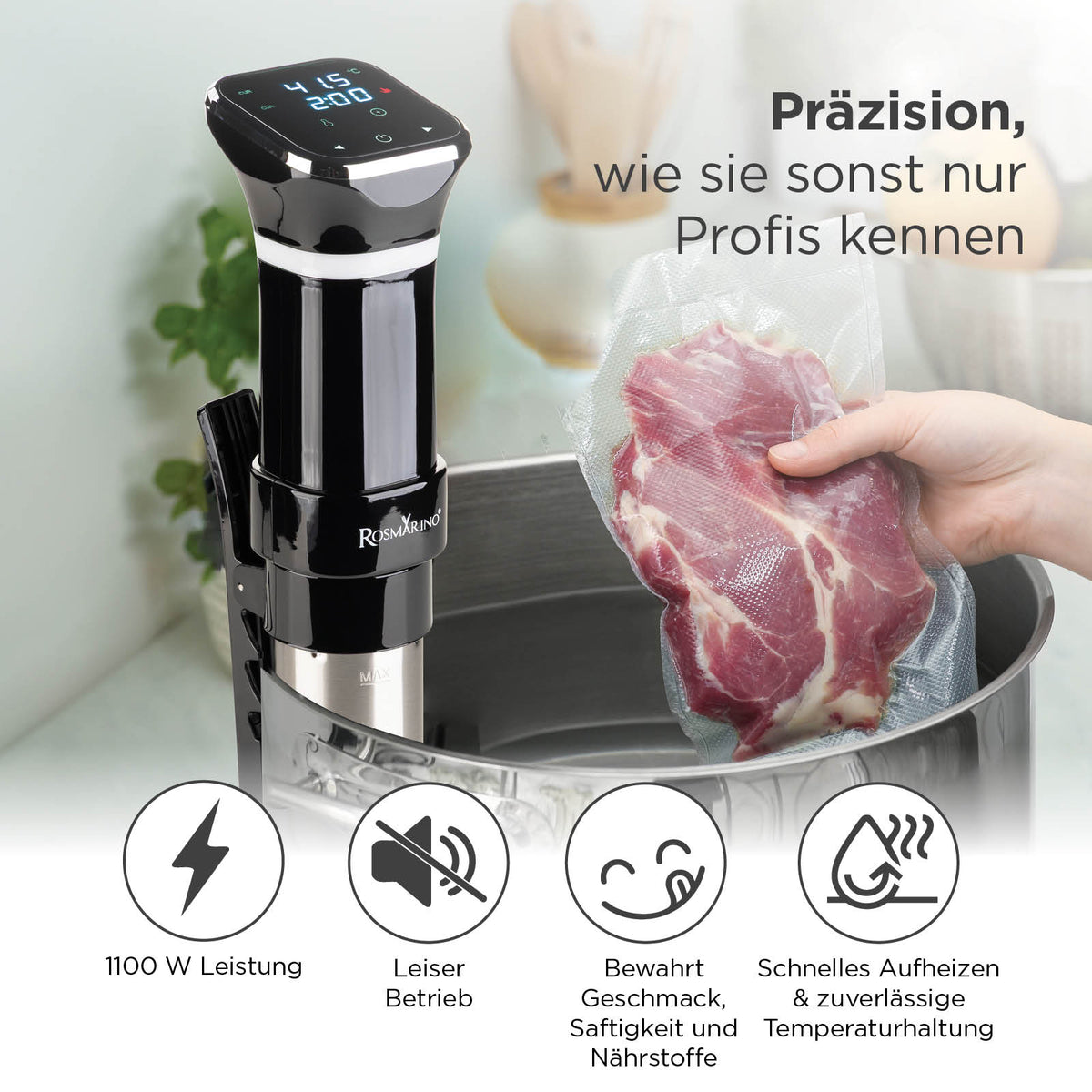 Haben Sie schon einmal in einem Spitzenrestaurant ein Steak gegessen und sich gefragt, wie es so perfekt gegart und saftig sein kann? Die Antwort lautet Sous-Vide – eine Methode des langsamen Garens im Wasserbad bei konstanter Temperatur. Mit dem Sous-Vide-Garer Rosmarino erzielen Sie professionelle Ergebnisse ganz ohne Stress oder Rätselraten. Dank präziser Temperaturkontrolle und 1100 W Leistung für schnelles Aufheizen können Sie Fleisch, Fisch oder Gemüse genau nach Ihrem Geschmack zubereiten – vom rosa Steak bis zum sanft gegarten Lachs. Die Lebensmittel behalten dabei ihr volles Aroma, ihre Saftigkeit und ihre Nährstoffe, da sie im eigenen Saft garen. Einfach die Zutaten vakuumieren, ins Wasserbad legen und das Gerät den Rest erledigen lassen. Die ideale Wahl für alle, die mehr aus ihrer Küche herausholen möchten – ganz ohne komplizierte Abläufe.